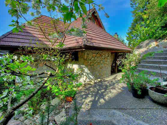 石屋外观:别墅采用经典石材结构,搭配红褐色斜屋顶,坐落于绿意盎然的环境中。门前铺设小径,两侧点缀盆栽与花草,营造出静谧、隐秘的度假氛围。