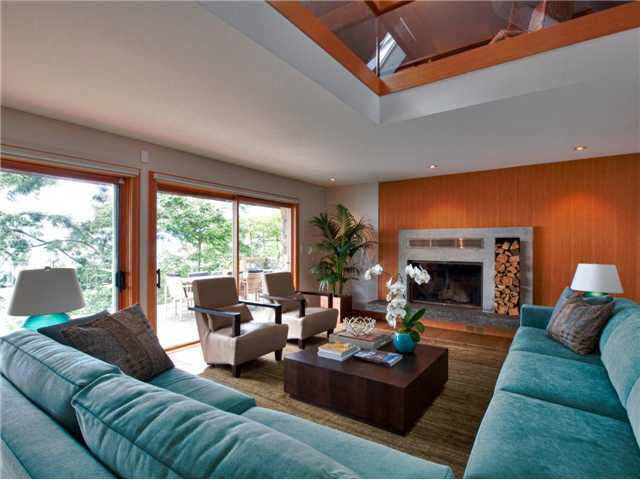 壁炉客厅:两组墨绿色沙发围绕木质茶几,背景墙为竖向木板与石材壁炉,内嵌柴火储物区,天窗与落地玻璃门引入自然光,温馨又现代。