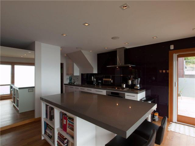 现代厨房:白色橱柜搭配黑色高光背板与灰色岛台,配备不锈钢厨电与吧台座椅,玻璃门通向户外露台,采光极佳。