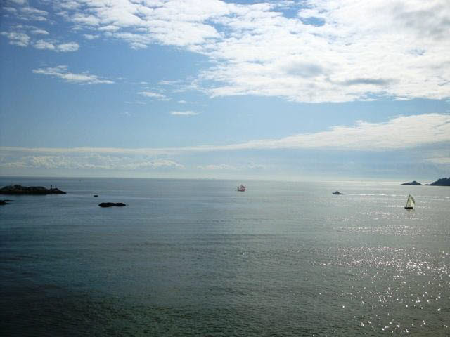海景座椅区:藤编桌椅环绕小盆栽,背靠绿树,面朝海面与远处船只,是理想的早餐或下午茶场所。
