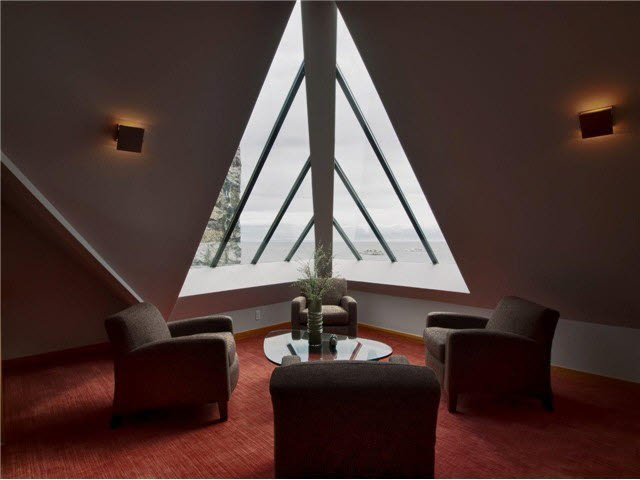 三角窗客厅:几何感十足的三角形房间,设有大面积落地窗,直面海景与树林。四张深色扶手椅围绕玻璃茶几,红色地毯与壁灯营造温馨氛围。