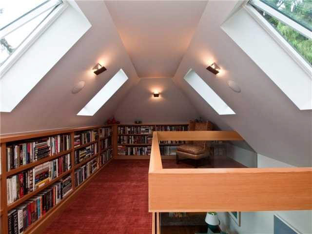 阁楼图书室:阁楼改造为阅读空间,四扇天窗引入自然光,两侧木质书架陈列丰富藏书,尽头设有舒适单椅,适合静心阅读或写作。